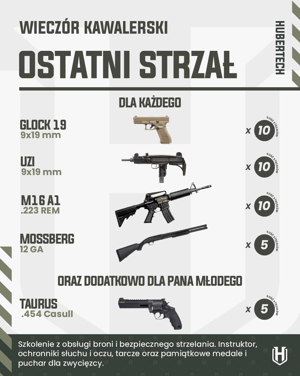 W ramach pakietu otrzymujecie szkolenie z bezpiecznej obsługi broni i bezpiecznego posługiwania się nią, opiekę instruktora, ochronniki wzroku i słuchu, tarcze.